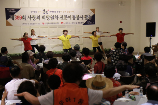 사단법인 전주시자원봉사센터(이사장 황의옥)는 22일 우아1동 전주 웨딩의 전당에서 지역 어르신 300명 대상으로 따뜻한 점심식사와 문화공연, 헬스케어서비스 등으로 이뤄진 '사랑의 희망열차 전문이동봉사활동'을 펼쳤다.