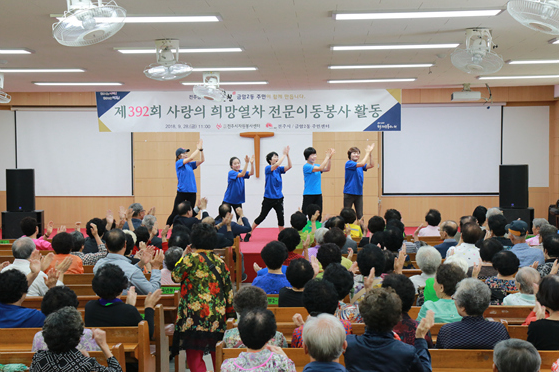 사단법인 전주시자원봉사센터(이사장 황의옥)는 28일 금암2동 안디옥교회에서 지역어르신 300명 대상으로 따뜻한 점심식사와 문화공연, 헬스케어서비스 등 나눔실천의 장인 사랑의 희망열차 전문이동봉사활동을 펼쳤다.