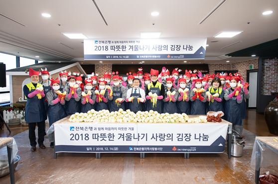 JB금융그룹 전북은행지역사랑봉사단(공동단장 임용택 은행장, 최강성 노조위원장)과 전주시자원봉사센터(이사장 황의옥)는 지난 14일 전북은행 본점에서 ‘2018 따뜻한 겨울나기 사랑의 김장 나눔’ 봉사활동을 실시했다고 밝혔다.
