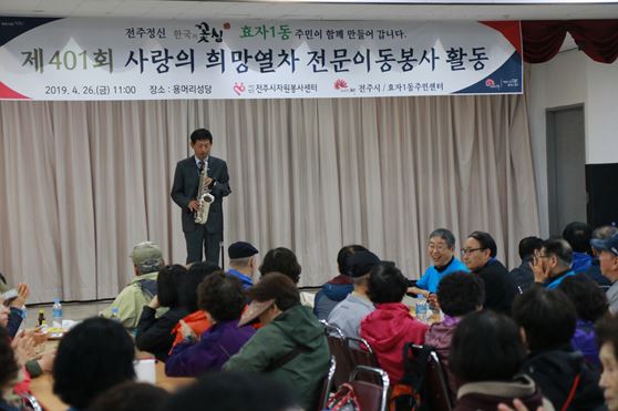 사단법인전주시자원봉사센터(이사장 황의옥)는 26일 효자1동 용머리성당에서 지역어르신 300명을 대상으로 따뜻한 점심과 문화공연, 헬스케어서비스 등 나눔실천의 장인 ‘사랑의 희망열차 전문이동봉사활동’을 펼쳤다.