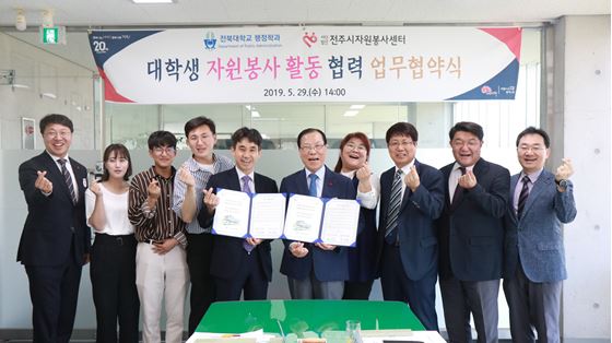 [투데이안]사단법인 전주시자원봉사센터(이사장 황의옥)과 전북대학교 행정학과(학과장 주상현)는 전북대학교 행정학과 학생들의 자원봉사 참여를 위한 업무협약을 29일 전주시 자원봉사센터에서 체결했다.